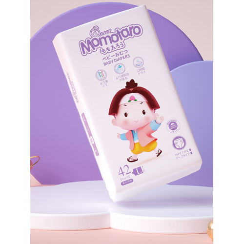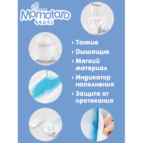 Инновационный абсорбент подгузников Momotaro быстро впитывает и удерживает влагу, поддерживая сухость в течение длительного времени, а структура внутреннего слоя подгузников защищает от комкования.