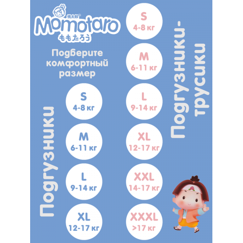 Детские товары Momotaro представлены в размерах 2/S, 3/М, 4/L, 5/XL, 6/XXL, 7/XXXL.